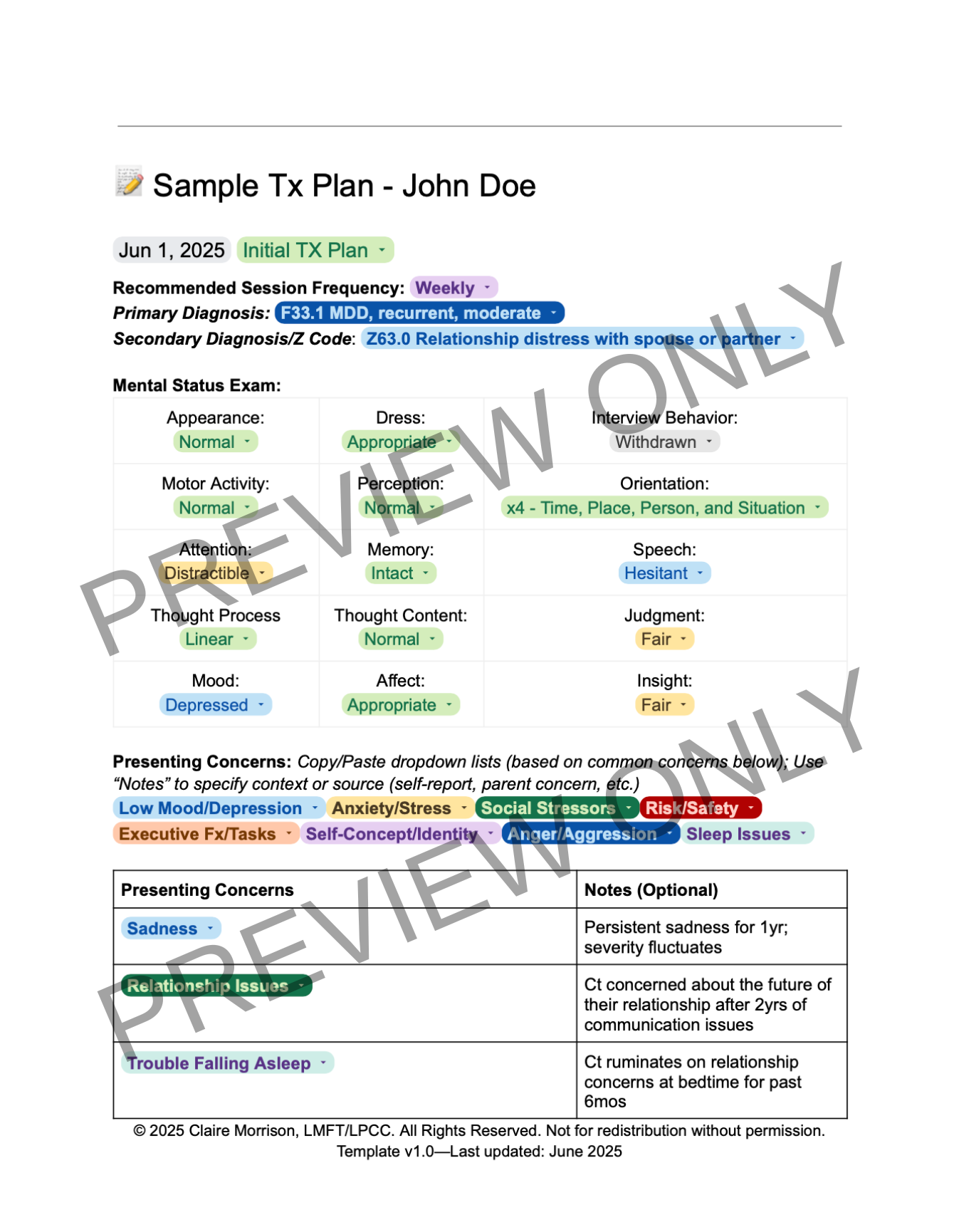 • Use Google Docs (or the included .docx) to quickly build structured, readable treatment plans using pre-filled dropdowns and guided sections.